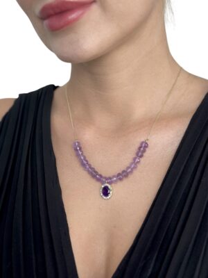 Ametist Taş Pırlanta Çerçeveli Altın Kolye
