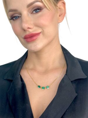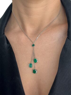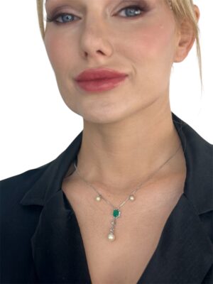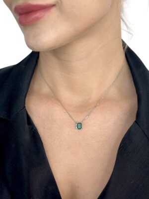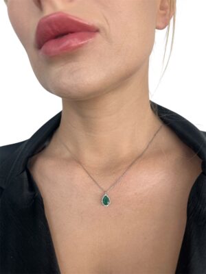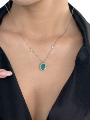 Damla Kesim Pırlanta Çerçeveli Zümrüt Taş Beyaz Altın Kolye