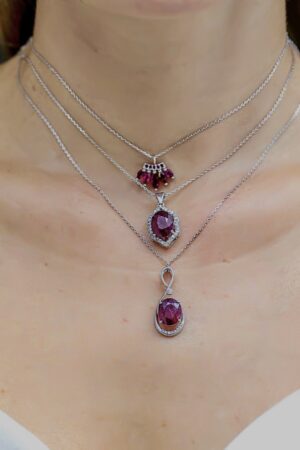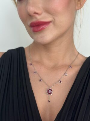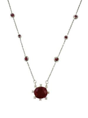Pırlanta Çerçeveli Yakut Taş VE 6 Taş Yakut Süslemeli Beyaz Altın Kolye